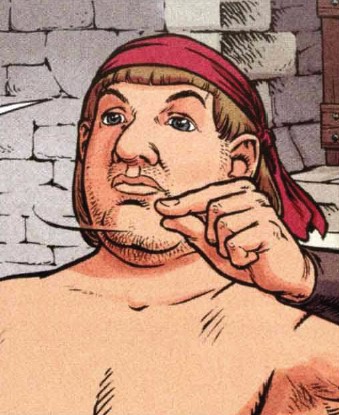 - C'est un chevalier aux cheveux bruns et courts, peu athlétique, assez rond et portant généralement la barbe, même si assez fine. Il ne se lave presque jamais (sauf contraint par Dame Mevanwi).